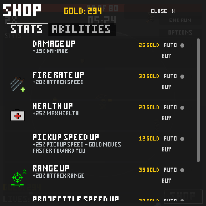 - Toggle on auto upgrade to immediately upgrade a stat when you have enough Gold (upgrades cheapest first)