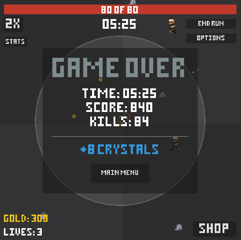 - When you die, you earn Crystals based on your score